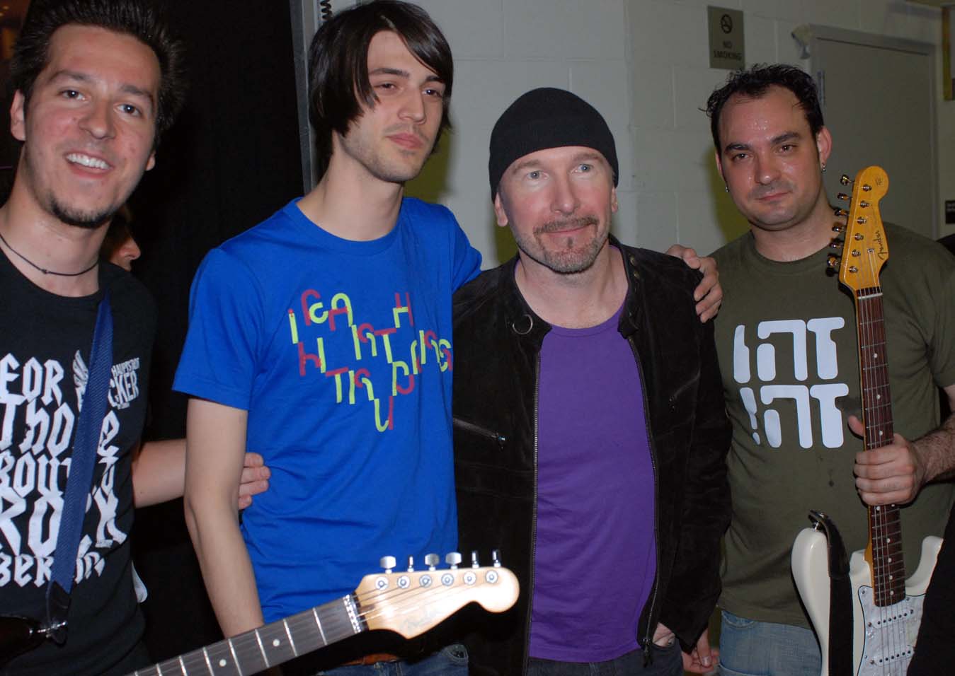 From the left: Mirsad “Cuni” Besic ’07, Kristopher Thiele, the Edge, and Shai Shaashua ’07 share a moment after the commencement concert.