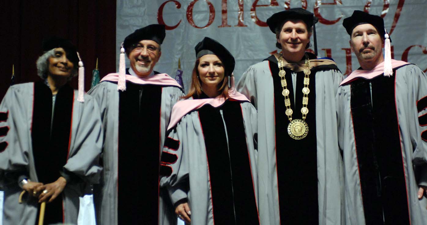 After receiving his honorary degree, the Edge emphasized to the graduates the importance of seeking their own musical voice. “To find your own voice, you have to abandon the official map and go into uncharted territory,” he counseled. “Learn to trust your own instincts and personal tastes above all else.” He also encouraged the students to seek collaborators. “Collaboration with talented people is not easy, but it’s essential. It’s the way to really shine brighter than you ever could on your own.”
