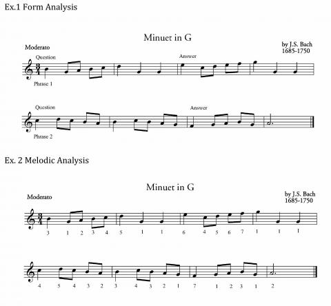 Once you’ve answered these questions, you are ready to play the example and then analyze the music you just played. Regarding structure, we have two four-measure phrases and, within each phrase, a question and an answer.