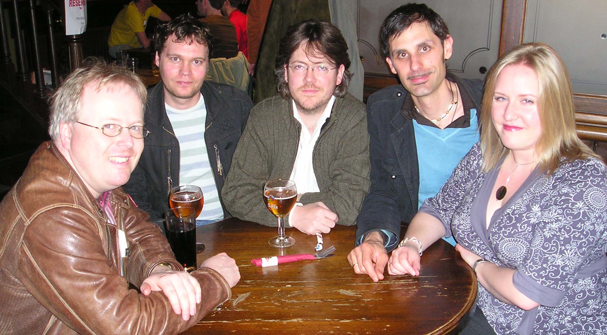 From the left: London-based alumni Sebastiaan de Krom ’97, Mons Ekstrom ’99, Chris Rodgers ’99, Rastko Rasic ’96, and Sarah Dawson ’97 gathered for an April 20 alumni reception at George IV Pub on Chiswick High Road in London.