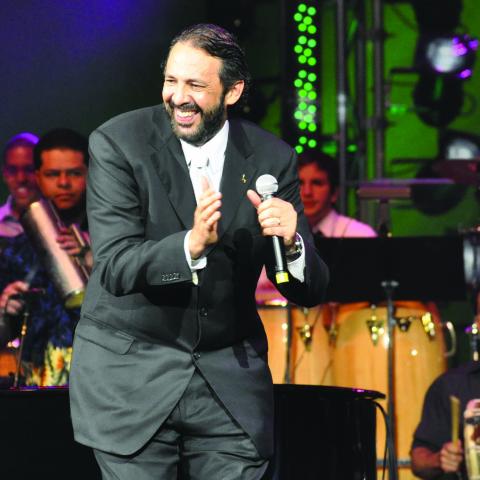 Five high-energy merengue and salsa tunes as well as the poignant “Bachata Rosa” celebrated Guerra’s contributions to Caribbean music. Students from the ensembles led by Assistant Professor Rebecca Cline had arranged all the Guerra selections. Vocalist Romulo Lander sang “El Niagara en Bicicleta” above razor-sharp horn lines and an arsenal of percussion instruments, including the güiro from Guerra’s native Dominican Republic. For his hit “La Bilirrubina,” Guerra joined the players onstage, thrilling the musicians and audience alike.