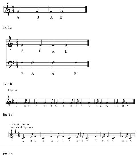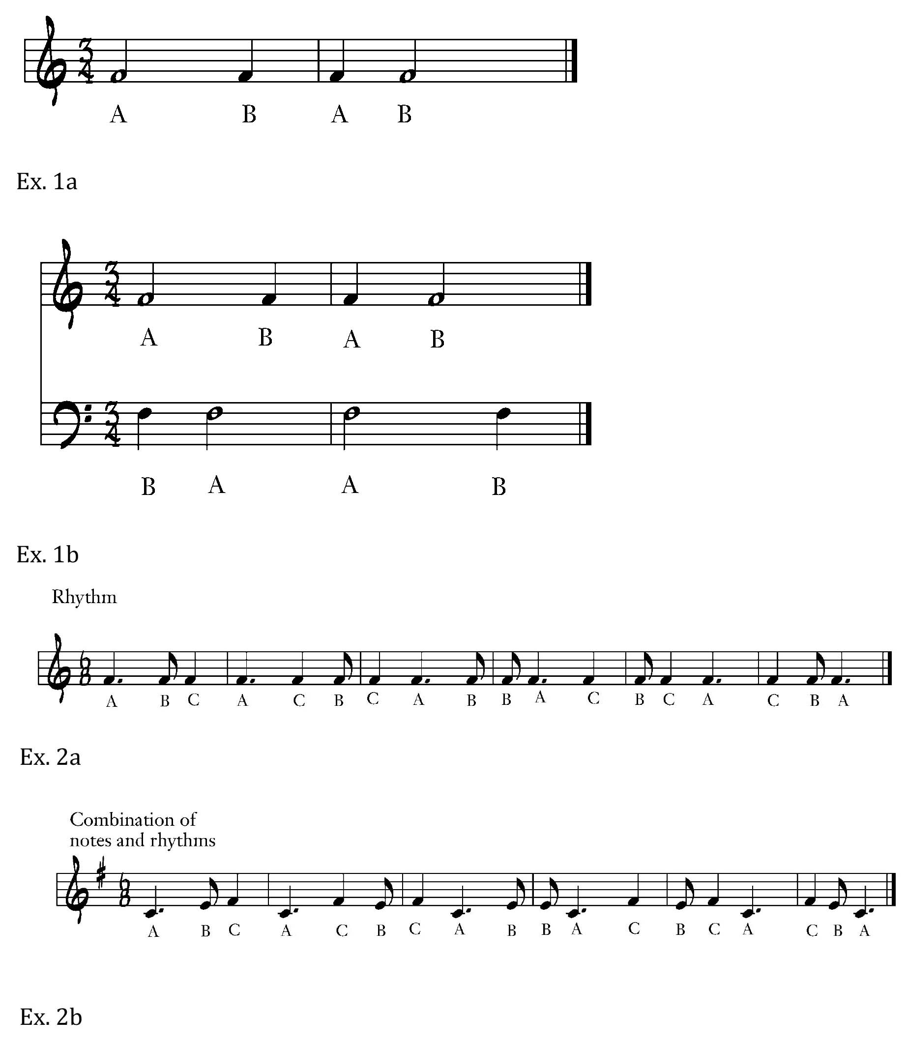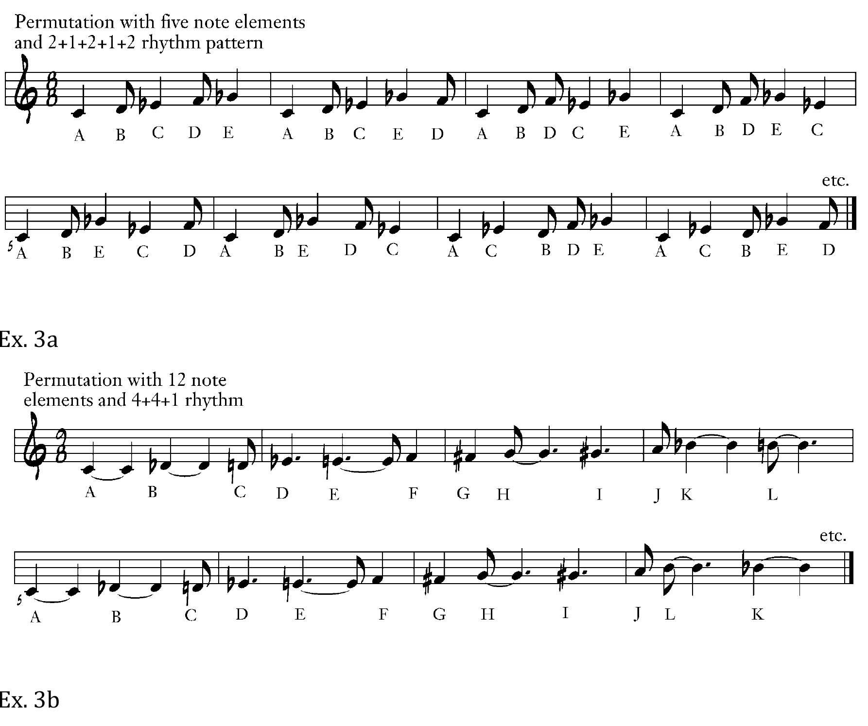 Example 2a illustrates this permutation with three rhythmic elements. Example 2b uses the three rhythms as well as three pitches.