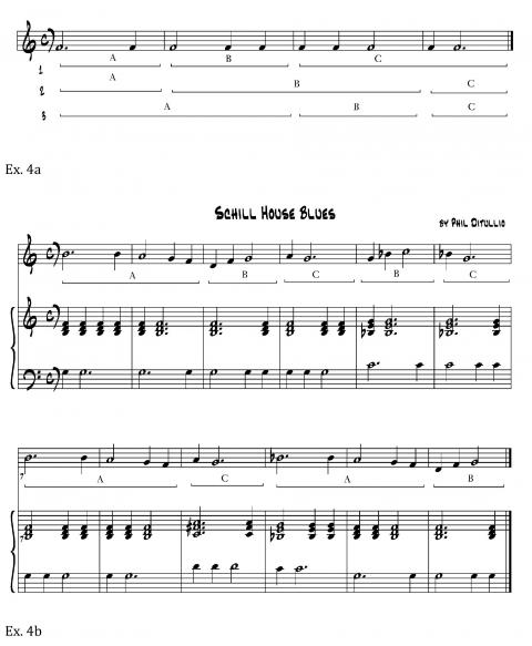 Example 4a shows the rhythmic pattern for a four-bar melodic phrase and the three possible groupings of the bars within the phrase. To construct a phrase, write three melodic elements based on the rhythm pattern. As previously, assign a letter to each element (A,B,C). Permute the elements in clockwise direction: ABC BCA CAB. Example 4b is a blues tune written this way. For this piece, I chose bar grouping 3 and adjusted the accidentals to fit the blues progression beneath.