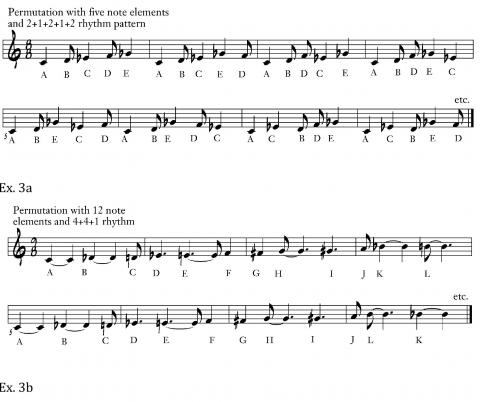Example 3a illustrates permutations with five melody notes and a repetitive rhythm pattern. Example 3b shows permutations with 12 melody notes. General permutations can be useful for creating scales of two to 12 notes for use as practice exercises to develop instrumental technique.