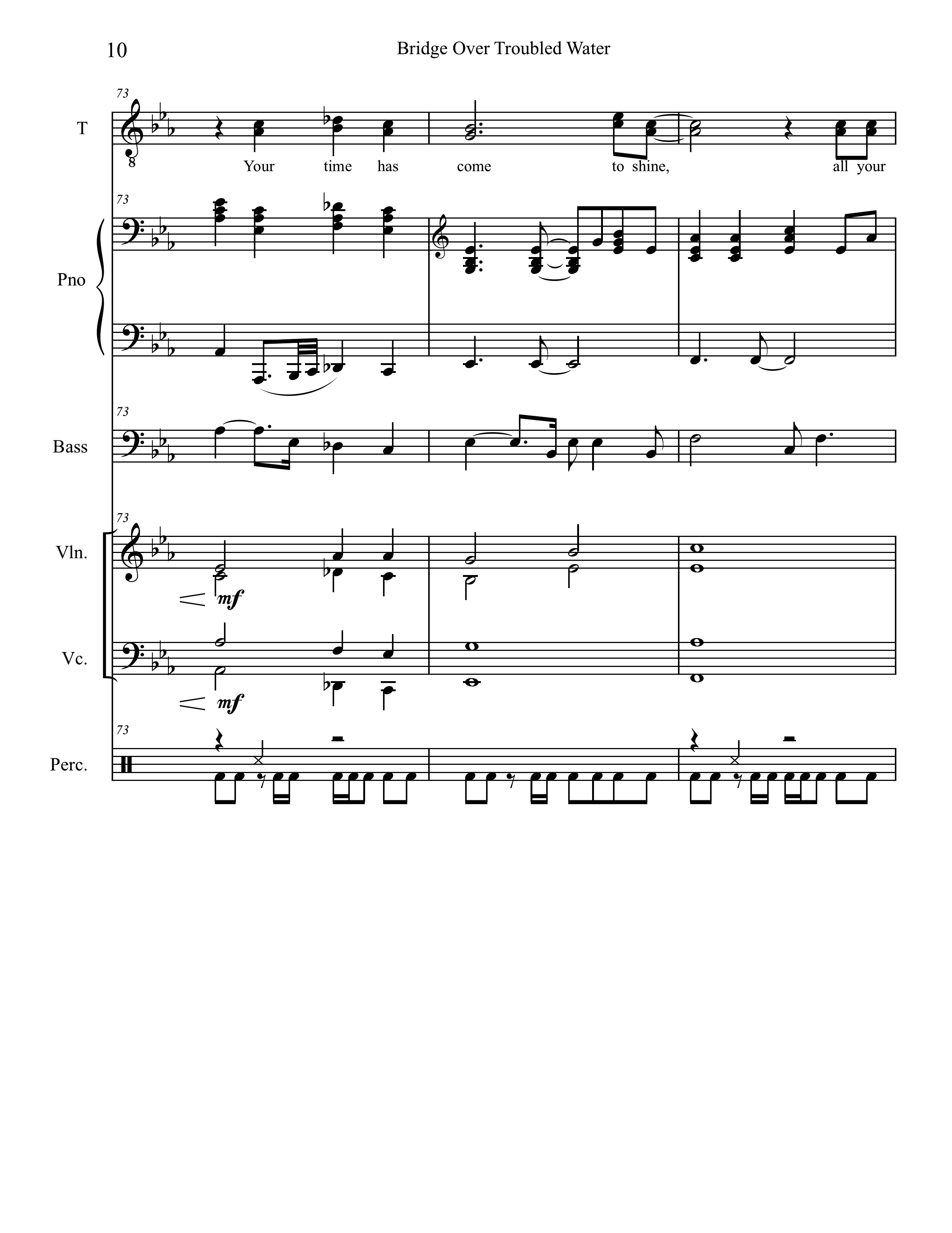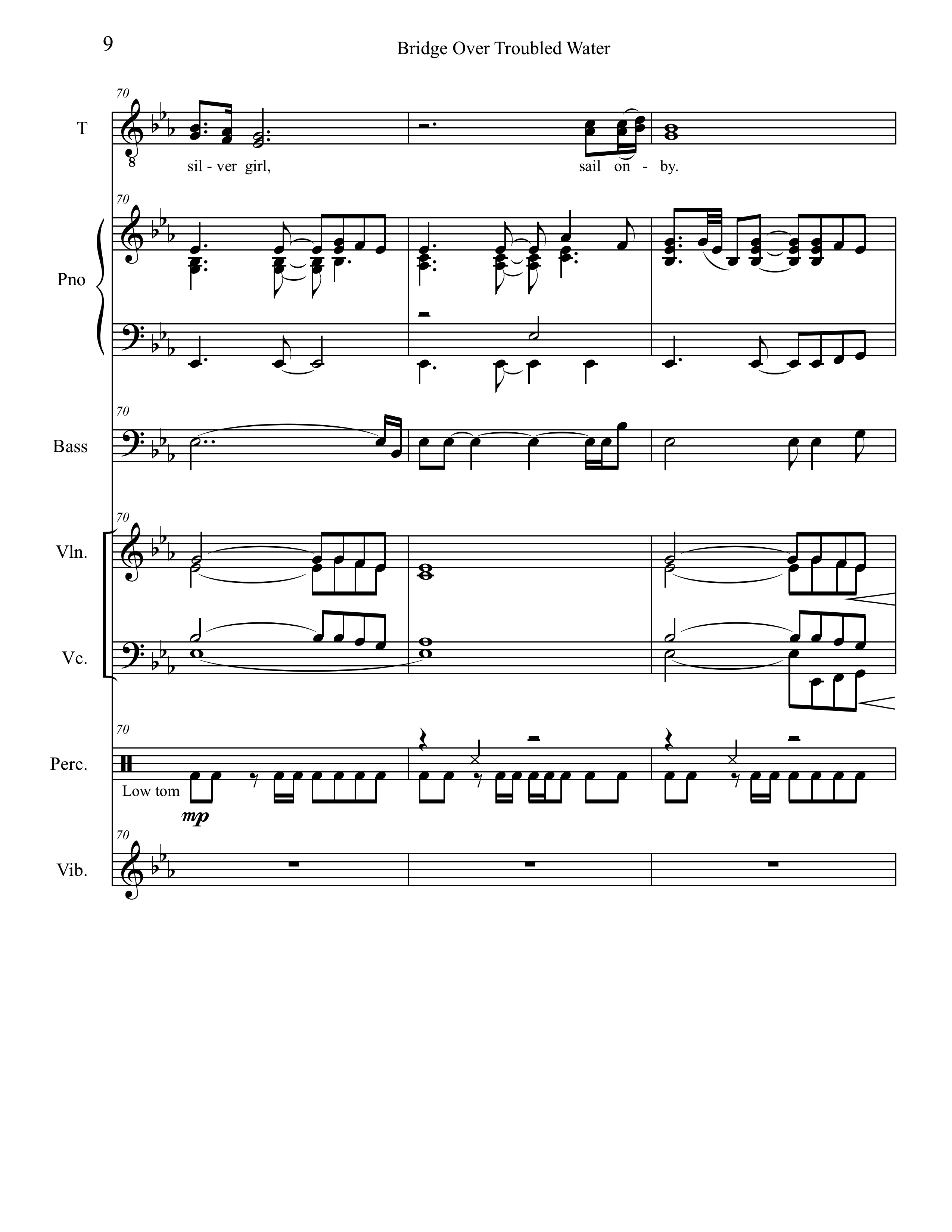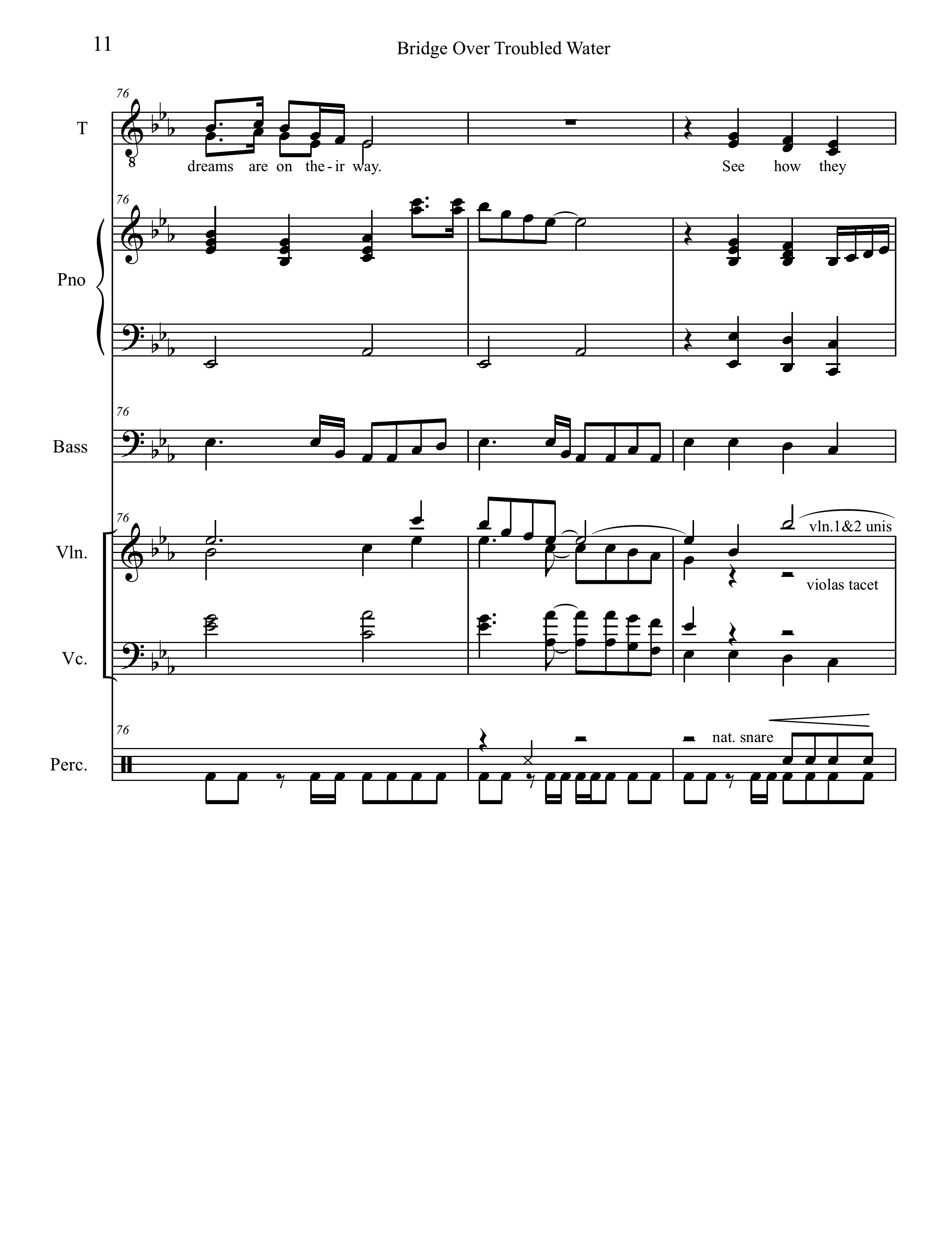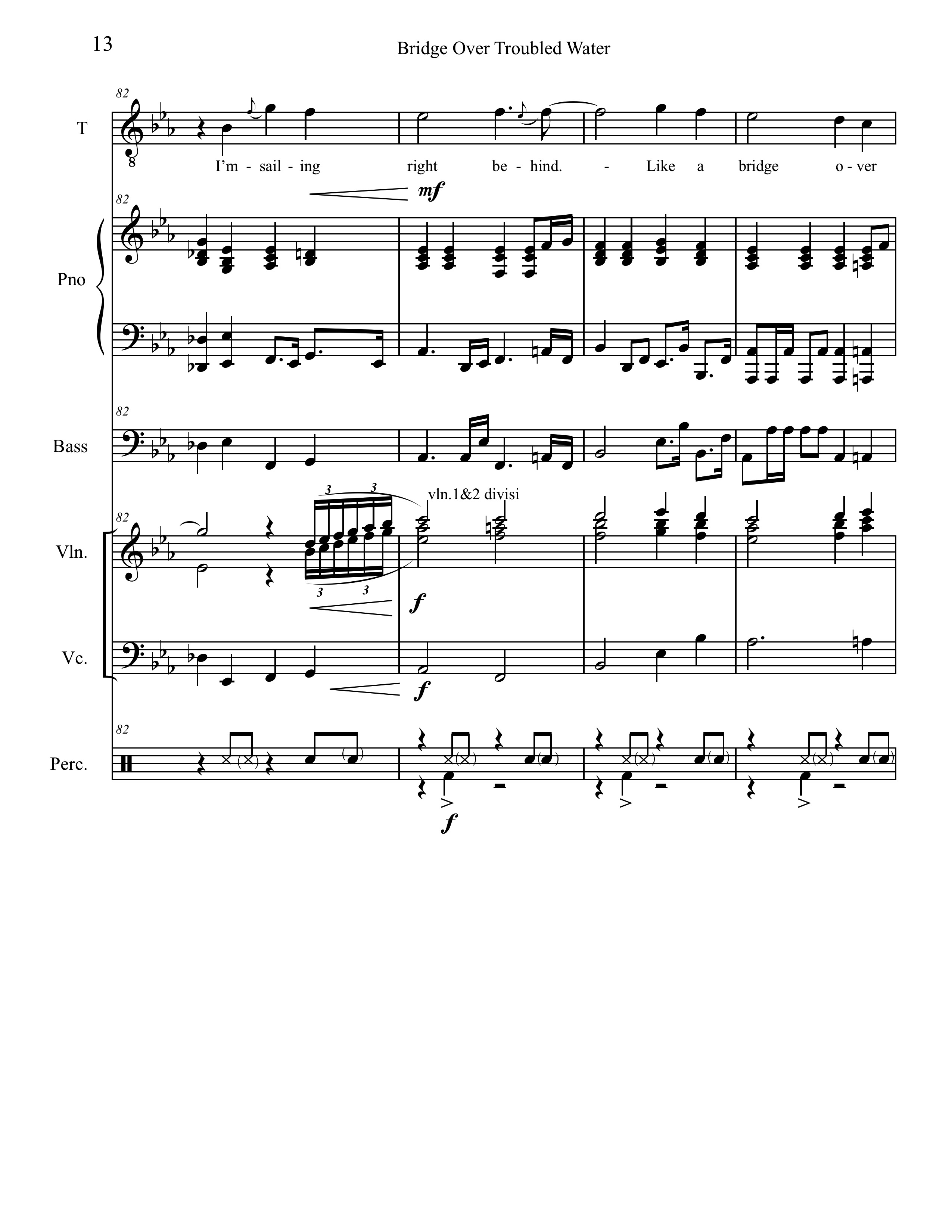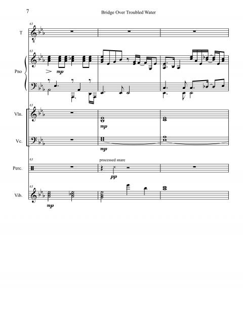 Seizing a spot for the strings to break out, Freeman wrote a series of quarter-note triplets in octaves for the violins that foreshadows Garfunkel singing that rhythm in bar 90. I made an educated guess that the violas play the lower notes of the high triads appearing in bars 83 through 99. At first glance, the spacing between the cellos and the violas seems very wide. Given his experience writing string charts, Freeman would have known that anything written in that middle range would likely get lost in the mix. Pop songs typically have lots of other sonic information in that register.