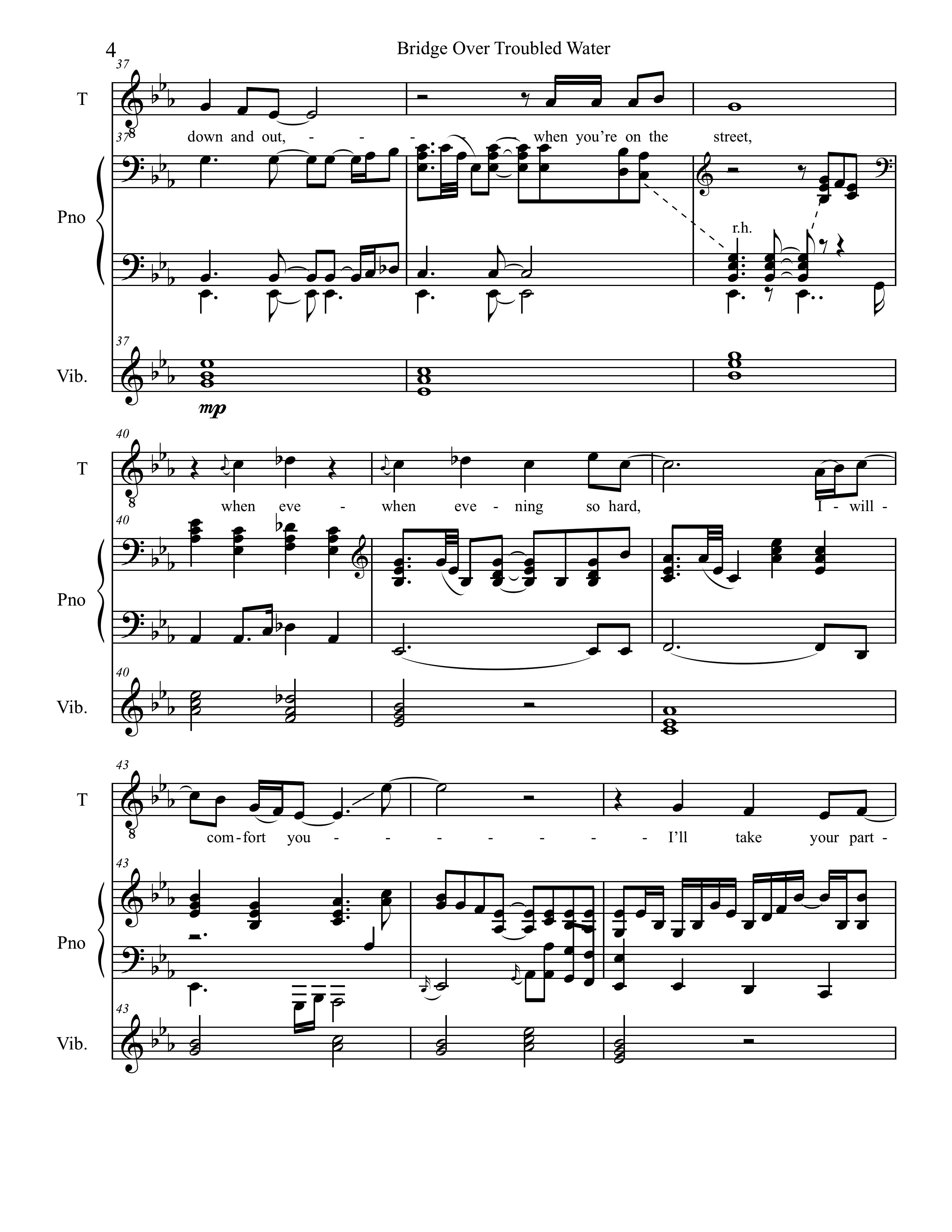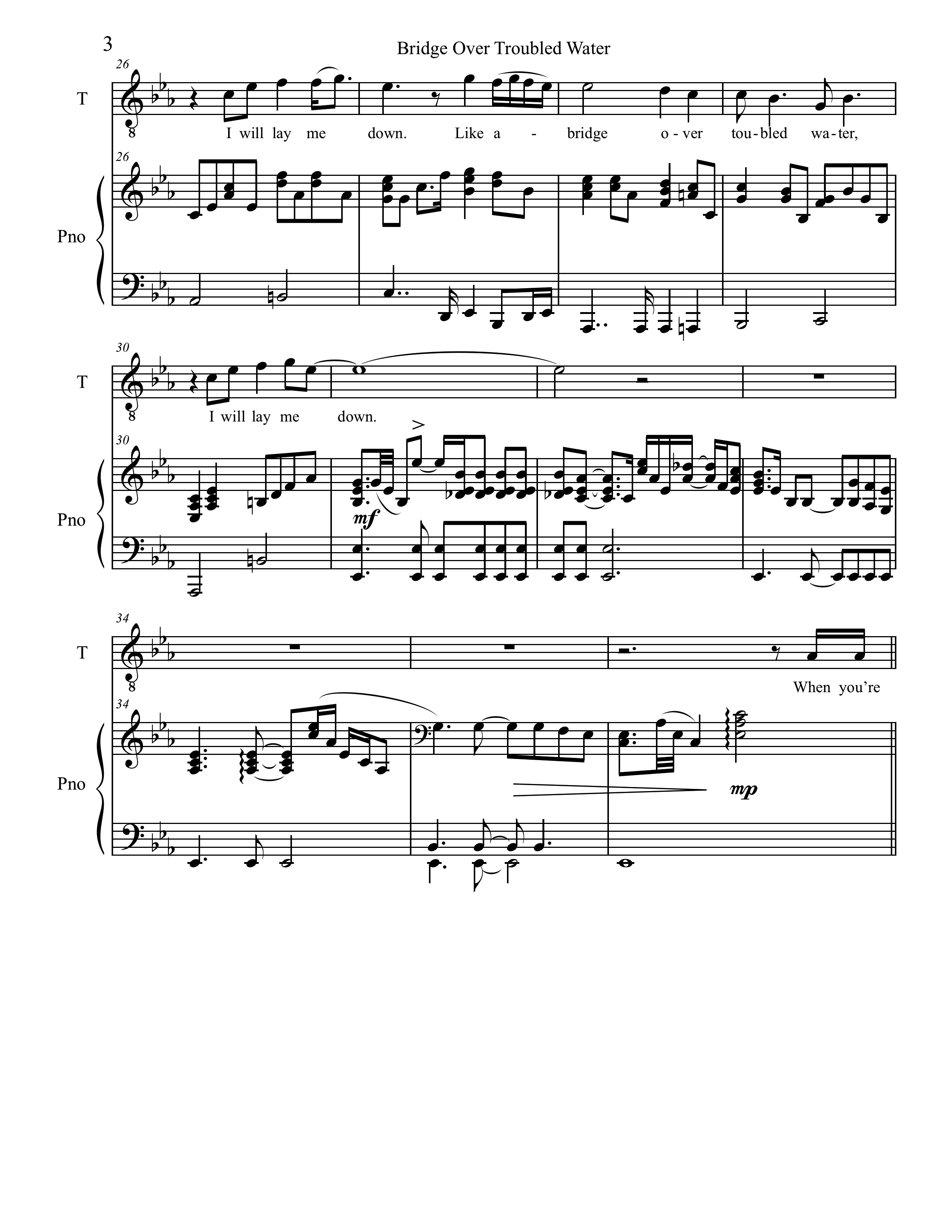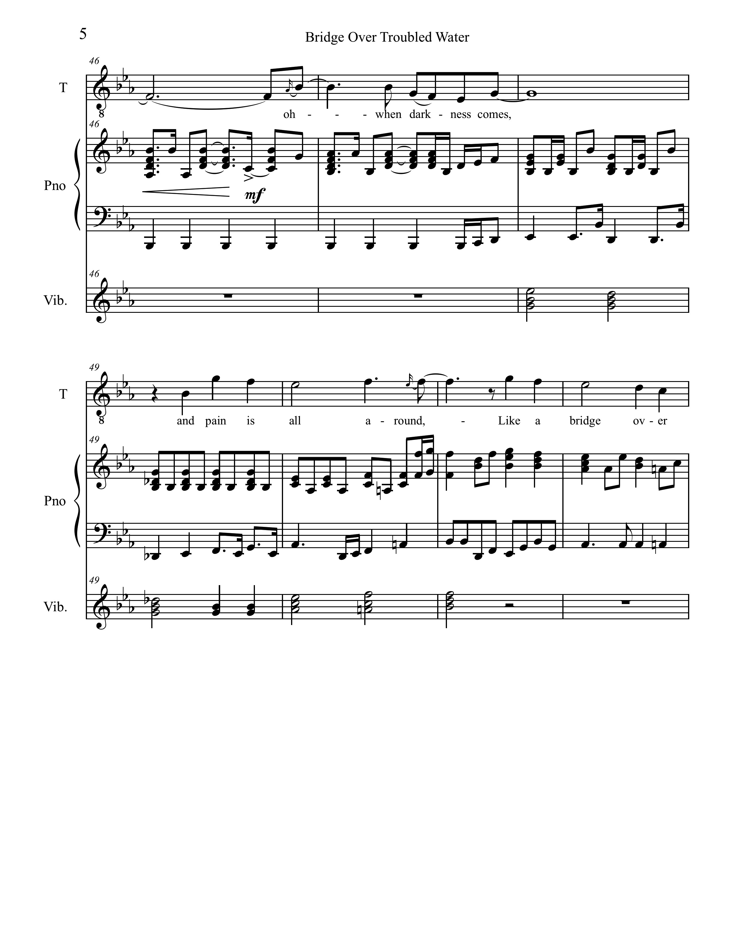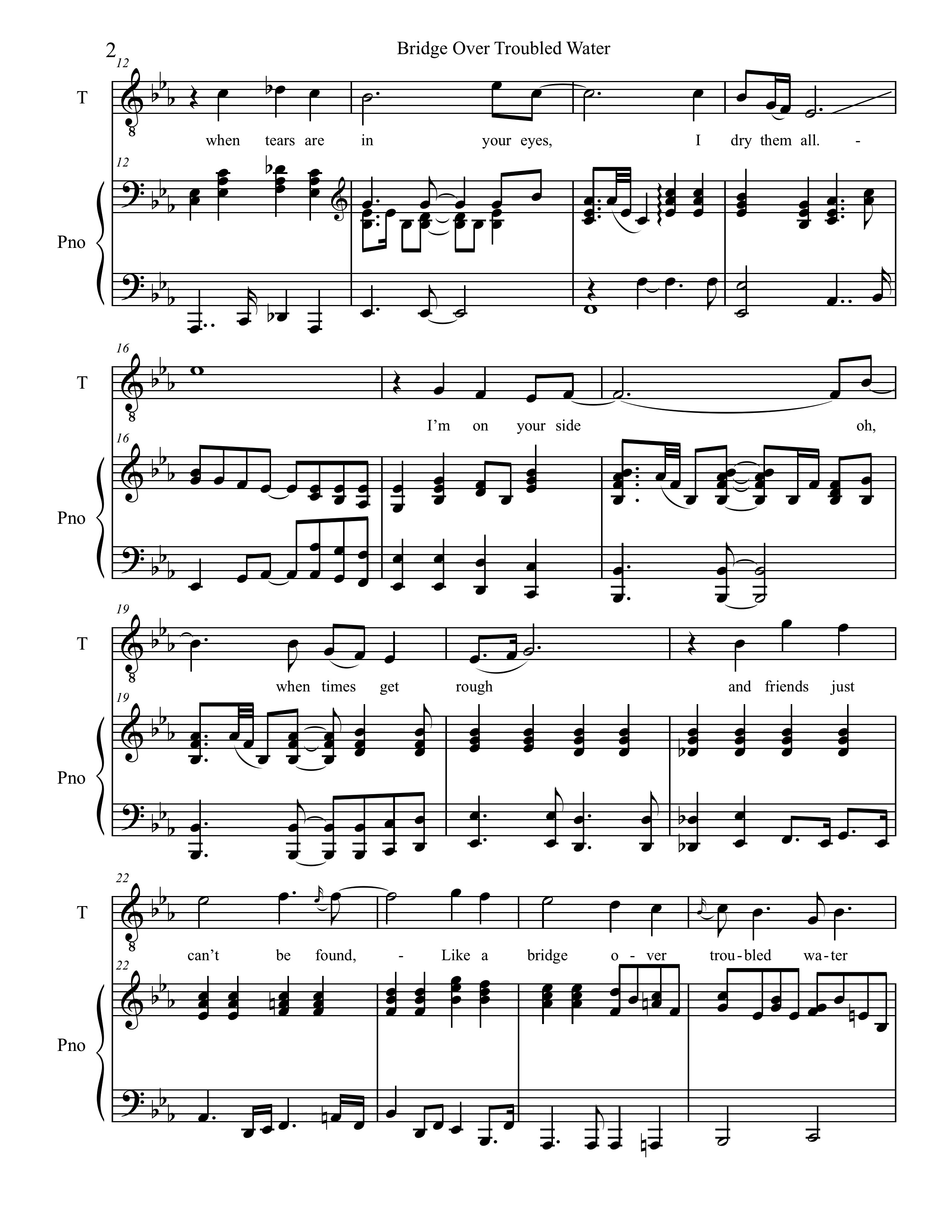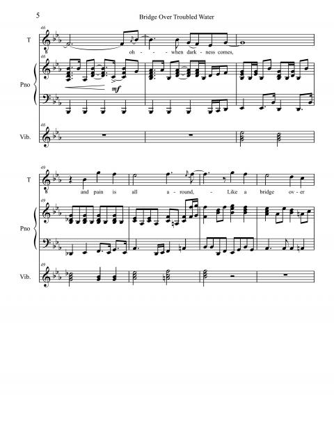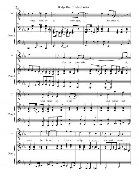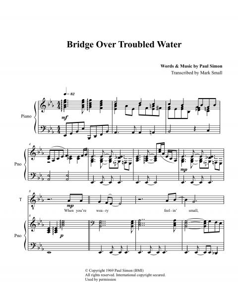 The melody is one of Simon’s best, extremely sing-able and catchy. The first half of the verse hovers around a G above middle C. In an interview, Garfunkel stated that in an early take, he was not singing the octave glissandi in bars 15 and 43. Simon rightly asked him to put them back in, restoring one of the song’s first melodic hooks. The melody is long for a pop tune, with the last line of each verse, “Like a bridge over troubled water, I will lay me down,” always sung twice. The intensity increases each time the melodic action goes up an octave.