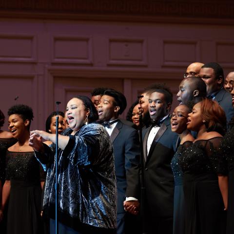The Fisk Jubilee Singers shone on spirituals such as “There Is a Balm in Gilead” and “Swing Low, Sweet Chariot,” among others. The evening also included performances by Berklee Voice Department professor Donna McElroy, an alumna of the Jubilee Singers; an orchestra featuring faculty members from Berklee and the Boston Conservatory playing pieces composed and conducted by Composition Department professor Julius Williams; Ensemble Department professor Dennis Montgomery III; the Boston Children’s Chorus; and student and faculty groups performing songs under the direction of McElroy and Jerome Kyles, assistant professor in Berklee’s Voice Department. McElroy drew a standing ovation for her soul-stirring performance of the spiritual “Soon Ah Will Be Done.”
