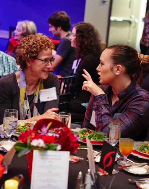 Soundbreaking donor Elizabeth Boland speaks with scholarship recipient Kayna Fanene.