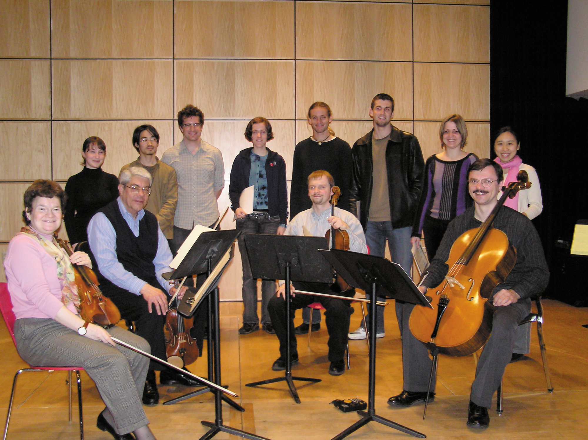 The Esterhazy Quartet, violinists Eva Szekely and John McLeon, violist Peter Neubert, and cellist Darry Dolezal, and the student composers whose works they performed in April 2004.