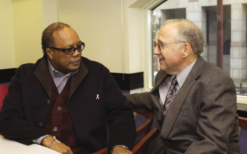 The first visitor was Quincy Jones, superstar composer/arranger, record producer, and label executive who came by to visit to his longtime friend Lee Berk as the president's last year at Berklee drew to a close. During the February 18 visit, Jones also took the opportunity to address a capacity crowd in the David Friend Recital Hall and shared some of his observations about the music industry over the past six decades.