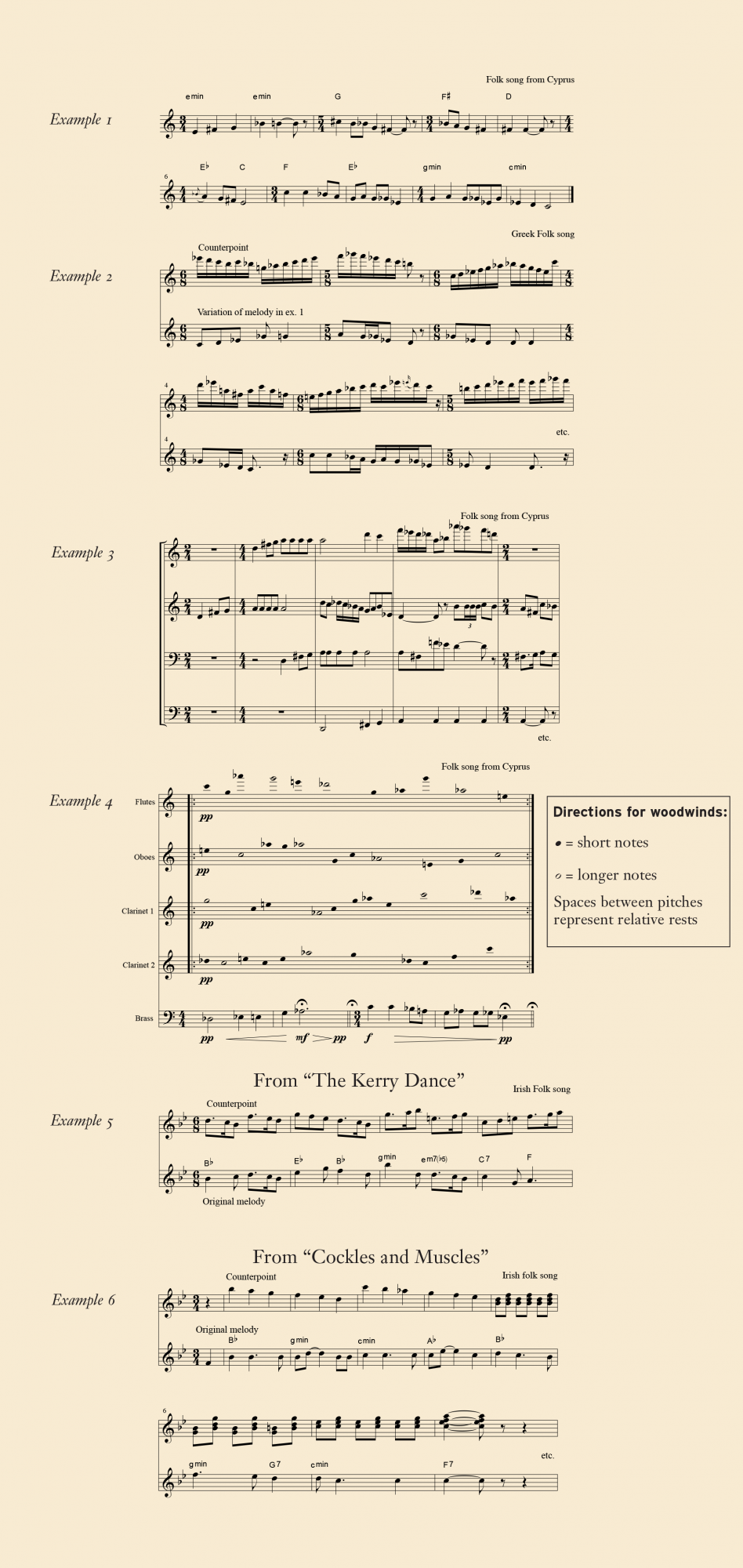 After searching through collections of folksongs, first Greek and later Irish ones, I selected melodies that appealed to me and that seemed to offer a variety of possible musical settings or treatments. In planning these works, I decided not to arrange the folk songs, but rather to incorporate them into and around my original music. I wanted the integrity of the songs to be preserved, and my original music to complement the folk melodies rather than create an incongruous contrast. I felt that the spirit of the folk songs should be foremost in these compositions.