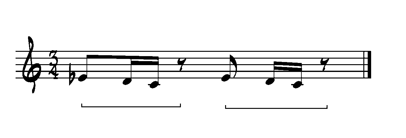 You can use several techniques to create a rhythmic unit. As shown in the examples, the rhythmic unit is shaped through the use of accents, rests, partial subdivision, and pitch. In all the examples, the initial rhythmic unit will be indicated with a bracket. Expressions such as "triplets phrased in four" and "triplets grouped in four" are interchangeable; both are correct.