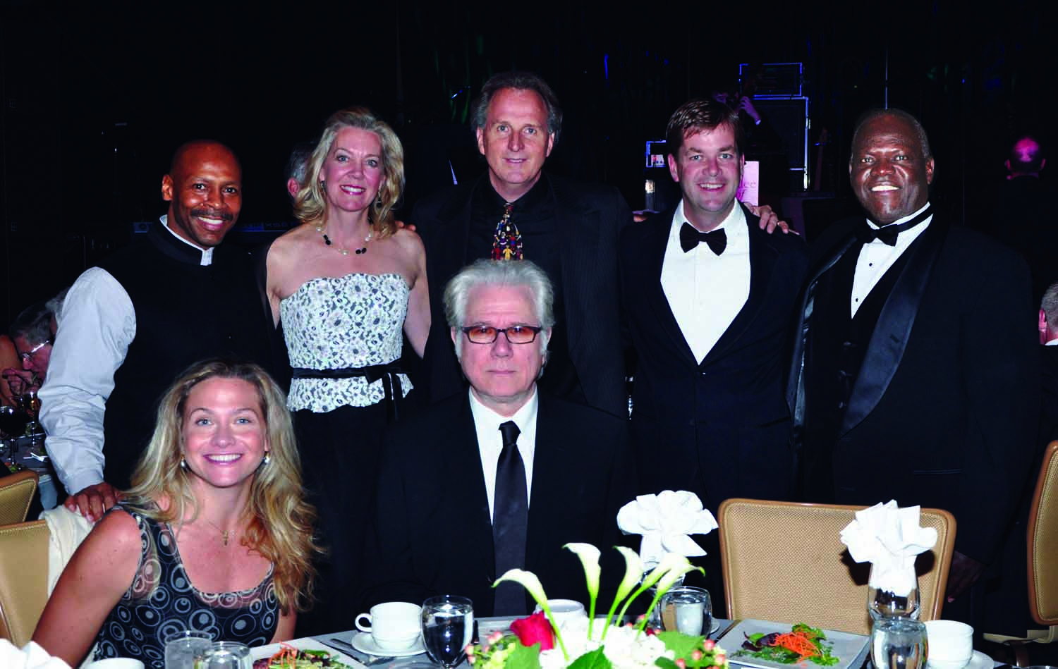 Back row, from the left: Kevin Eubanks ’79, Linda Mason, President Roger Brown, John Connaughton, and Francis Lutomia; front row: Sally Taylor and John Larroquette.