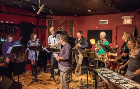 OddSong is a unique chamber jazz ensemble and compositional vehicle put together by Darrell Katz, director of the Jazz Composers Alliance (JCA). It’s a saxophone quartet, expanded with the addition of voice, violin, and marimba.
