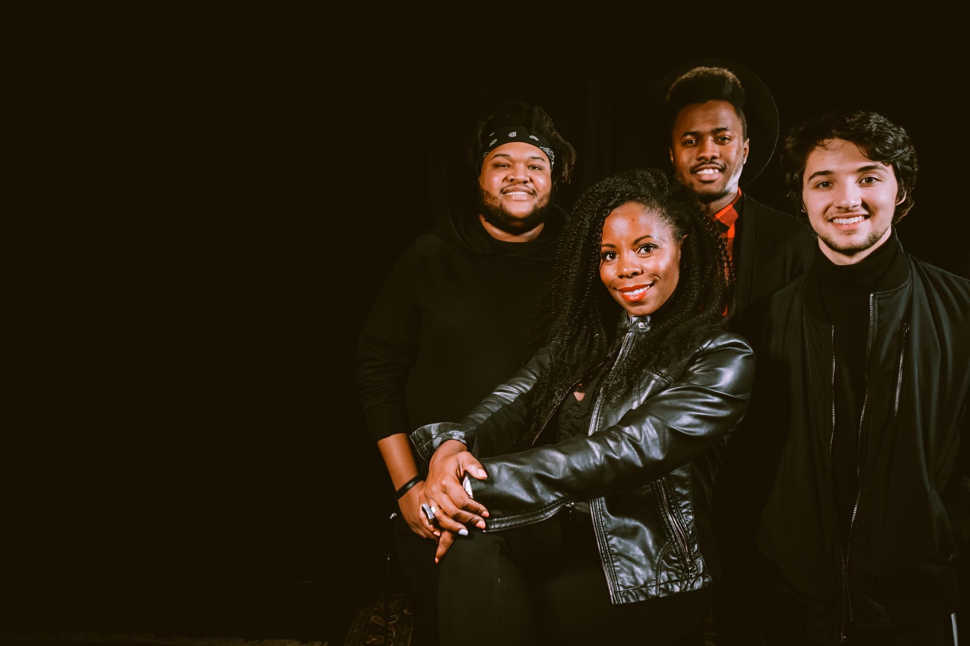 Professor Tia Fuller with student directors, from left, Aaron Ward, Marcus Prince, and Max Nudi.