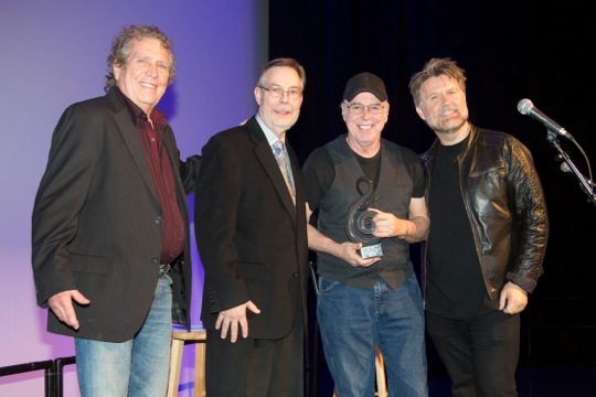 Pat Pattison, professor of songwriting; Jay Kennedy, vice president for academic affairs; drummer Eddie Bayers; and Stephen Webber, program director for music technology at Berklee’s campus in Valencia, Spain.