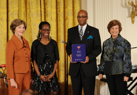 J. Curtis Warner Jr., executive director of Berklee City Music, and Krystal Banfield, director of City Music Boston, were among those honored by First Lady Laura Bush at a ceremony in Washington D.C. The Berklee City Music All-Stars and City Music student Erica Telisnor of Hyde Park were featured performers at the ceremony, which took place in the East Room of the White House on Friday, November 14.