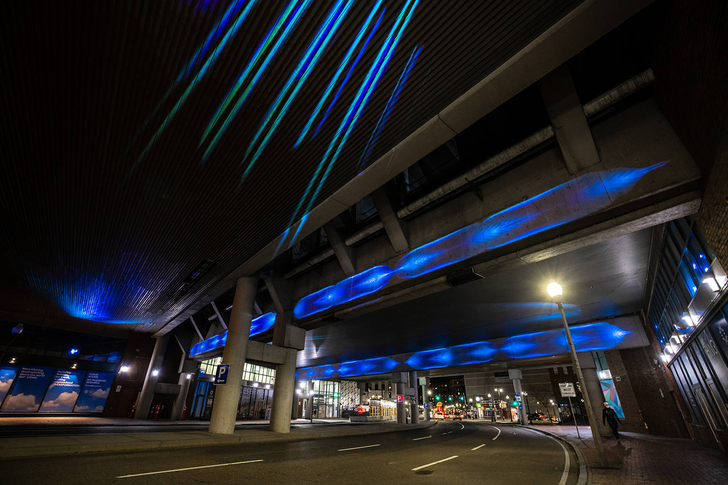 Her latest digital art installation, Float, located at One Congress Street at the 4.8-acre Bulfinch Crossing development, illuminates the beams and ceiling of the normally dark underpass. Featuring animal-inspired animations, vivid colors, and shifting patterns, along with music created by Hersch’s friend and frequent collaborator Ella Joy Meir B.M. ’14, the installation captures the energy of a neighborhood in the midst of a dramatic transformation.