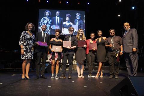Krystal Banfield (far left) and Larry Simpson (far right) with the seven recipients of Berklee City Music Scholarships (from left): Trevon Sullen-Trotter, Zalissa Stewart, Noah Rowe-Gaddis, Morgan MacNeil-Barry, Azana Hightower, Nia Harris, and Diamonte Darbouze.