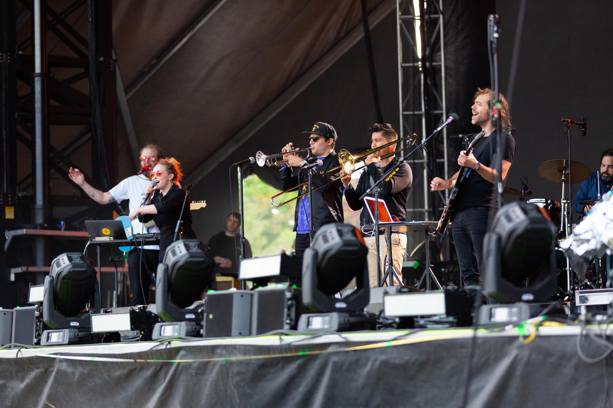 Trumpeter John Michael Bradford and trombonist Ethan Santos performing with Big Red Machine