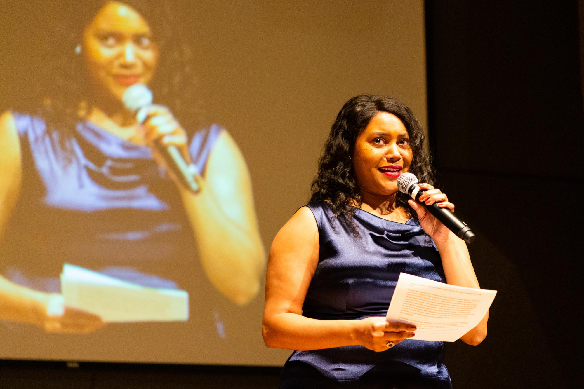 Mila Thigpen, chair of the Dance Division and the event's founder, gives remarks at the end of the show.