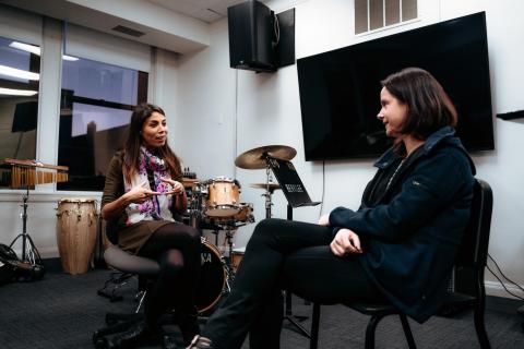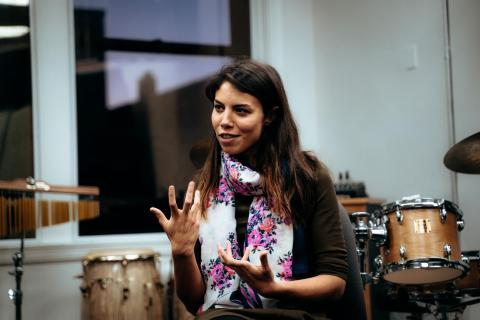 Chilean saxophonist and Berklee alumna Melissa Aldana B.M. '09 dropped by Berklee this week as a guest at the Gathering, an event series presented by the Institute of Jazz and Gender Justice. Aldana, a third-generation professional saxophonist, talked about her creative journey and answered students’ questions about practicing and facing gender discrimination as a performer.