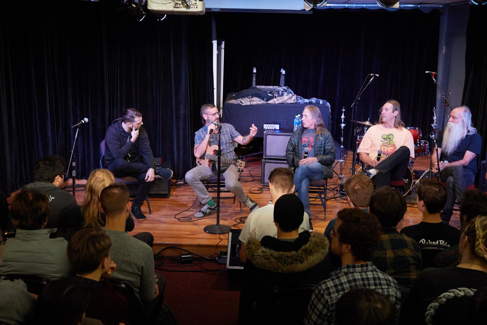 The panel discussion included, from left: Dave Marvuglio, bass instructor; Justin Chancellor; Steve Bailey, Bass Department chair; Danny Carey; and bassist Lee Sklar.