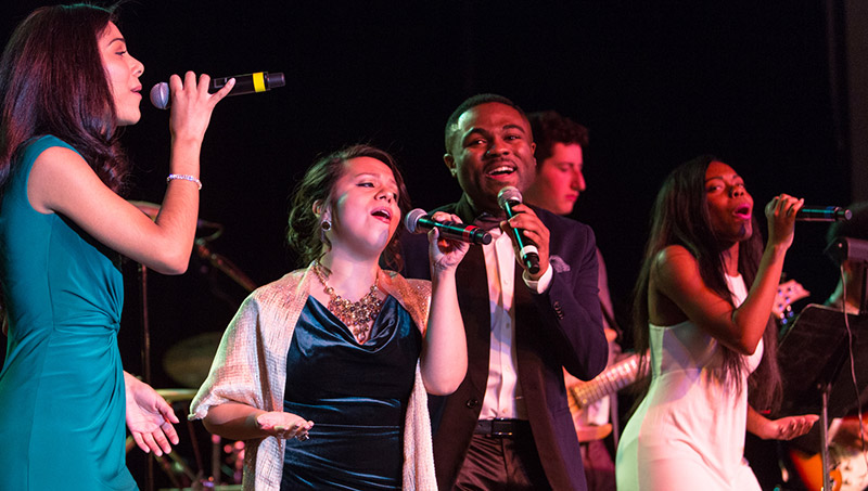 Berklee student Robert Gould (center) sings “That’s What Friends Are For” with other Berklee and Berklee City Music student performers at Berklee’s 21st annual Encore Gala to benefit the Berklee City Music Program. “It changed my life,” Gould says of the program.