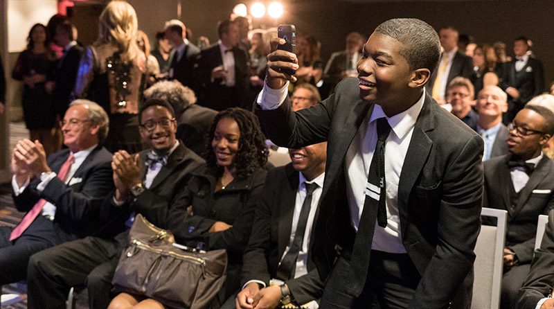 The gala swung into gear with a performance of Dionne Warwick’s “That’s What Friends Are For,” which featured lush vocals from Robert Gould, a Berklee student from Fayetteville, Georgia, who came to the college by way of the Berklee City Music program and who plans to graduate in the spring. Since coming to Berklee, Gould has taken on internships with the Grammys, Broadcast Music, Inc. (BMI), the Recording Industry Association of America (RIAA), and the pop duo Karmin; recorded with funk master George Clinton; and sung the national anthem in front of a crowd of some 30,000 baseball fans at Fenway Park—all told, an extraordinarily impressive start to his budding career.