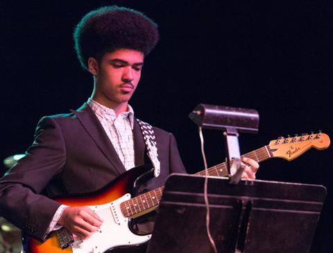 Berklee City Music All-Star Antonio Sheill-Loomis of Roxbury Crossing, Massachusetts, plays guitar with the band during the gala’s dinner-hour performances.