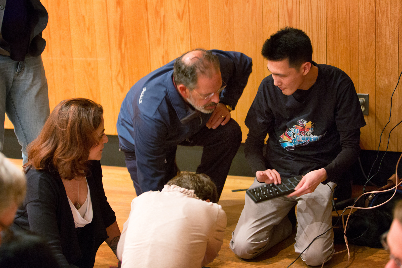 Berklee professor Chi Kim (far right) works with Perkins teacher Christine Boudreau and student Katriana W., while Berklee Trustee Steven Holtzman looks on.