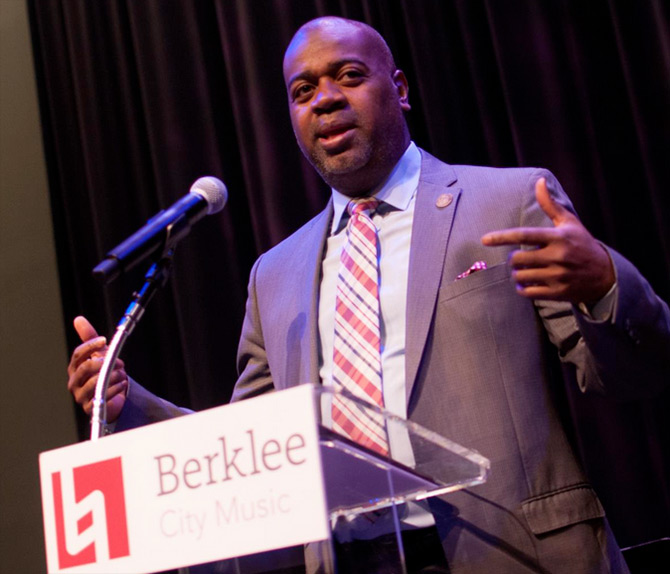 Newark, New Jersey Mayor Ras Baraka greets attendees at the Berklee City Music Summit, co-hosted by the New Jersey Performing Arts Center.