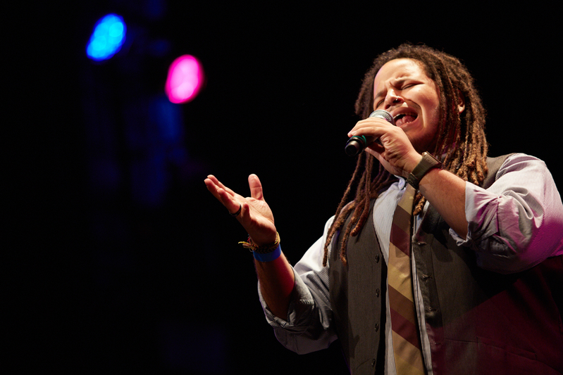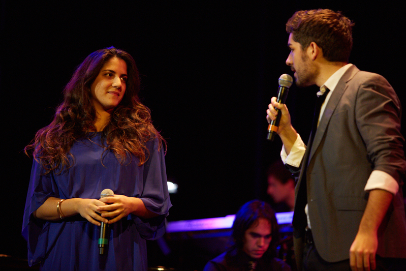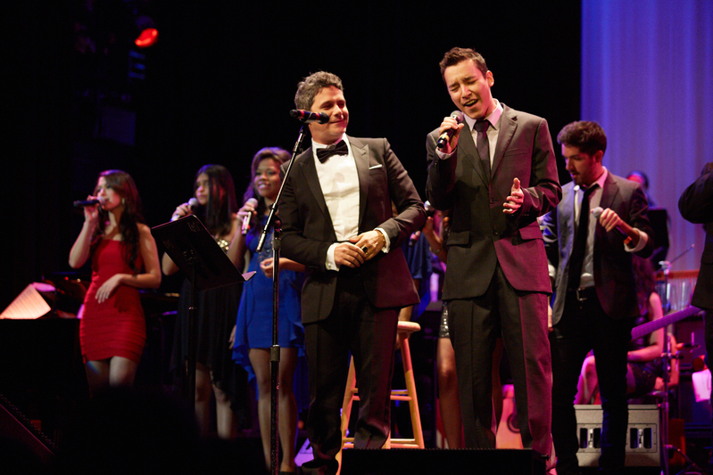 Alejandro Sanz joins students on stage. Pictured (foreground): Alejandro Sanz and Johan Sotelo.