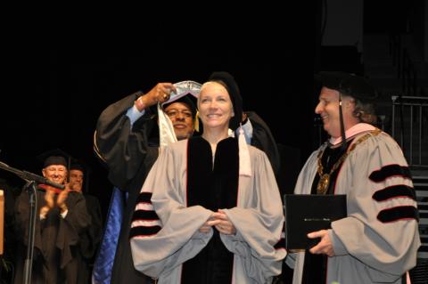 Annie Lennox receives her honorary degree at Berklee's commencement.