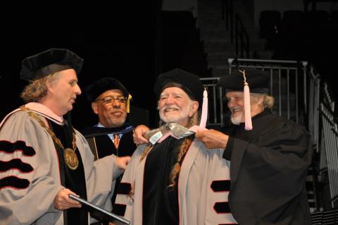 President Brown enlisted Kris Kristofferson, Nelson’s guest for the festivities, to help present Nelson’s honorary doctorate. The longtime friends had performed a duet of Hank Williams’s “Jambalaya (On the Bayou)” at the previous night’s commencement concert. Recalling the student performance during his acceptance, Nelson said, “Last night was especially tremendous. I enjoyed hearing everyone play and sing so many great songs. The history of music is good, but the future is even better, thanks to you folks.”