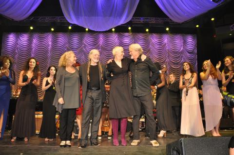 Carole King, Willie Nelson, Annie Lennox, and Kris Kristofferson take a bow at Berklee's 2013 commencement concert with graduating seniors.