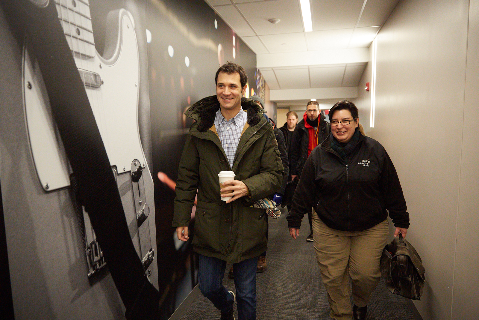 Djawadi (pictured here with Jeanine Cowen, vice president for Academic Affairs) toured the campus, including the new 160 Massachusetts Avenue building and its facilities. "It’s just mind-blowing," he said. "I’m so overwhelmed, I’m speechless. It’s so cool. I could go on and on and on about all the cool rooms and classrooms and equipment that I didn’t have when I was here. And it’s just really amazing to see that Berklee is always pushing forward and expanding.”