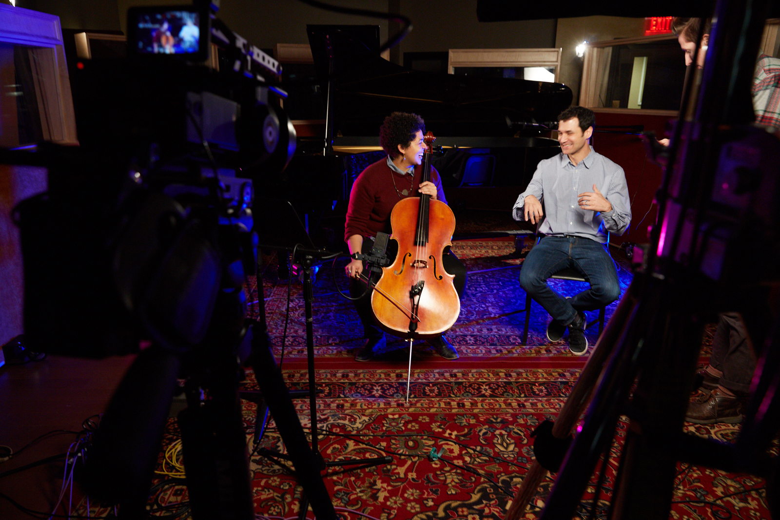 Djawadi sits with Boston Conservatory at Berklee cello student Olivia J.P. Harris during a video shoot as she plays the theme for 'Game of Thrones.'