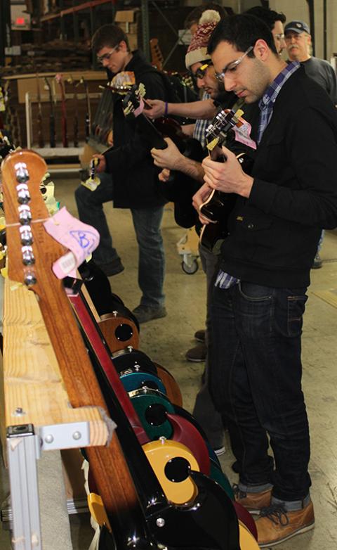 Students tour the Gibson USA electric guitar plant in Nashville, where they were introduced to the process of crafting guitars as well as a prototype of the Midtown-X, a Bluetooth-enabled electric guitar that tunes itself, an innovative technology that will hit the market in approximately six months.