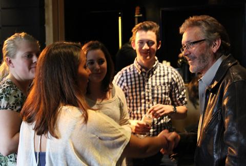 Producer and songwriter Keith Stegall meets with students after his presentation at Warner Music Nashville. “I encourage you to do whatever the seed that is planted in your core tells you to do,” Stegall told students.