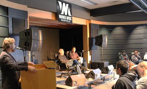 On March 14-19, 2014, 120 students traveled to Nashville with Berklee to learn about the music industry. Above: Berklee professor Stephen Webber introduces father and son producers Kyle and Jason Lehning.
