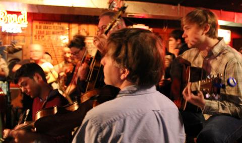 Berklee student Bill Grady (center left) sits in on the bluegrass jam with some of Nashville’s finest.