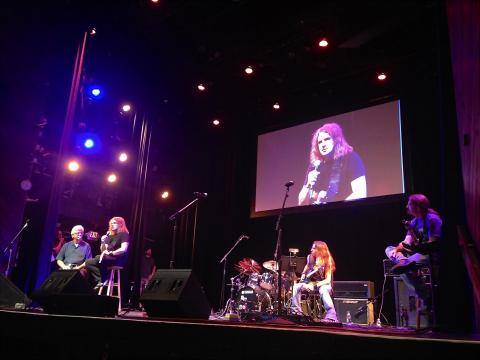 “Are you ready to rock?“ he asked more than 200 Berklee and Five-Week Summer Performance program students, many of them decked out in T-shirts from Megadeth, Iron Maiden, and other iconic metal bands. Then Ellefson, backed by Berklee faculty Henrique De Almeida on drums, and Don Lappin and Ethan Brosh on guitar, invited the students to surround the stage as he powered out some of his own tunes.