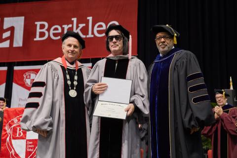 Todd Rundgren '17H (center) receives an honorary doctorate from Berklee President Roger H. Brown (left) and Larry Simpson, senior vice president for academic affairs and provost (right).
